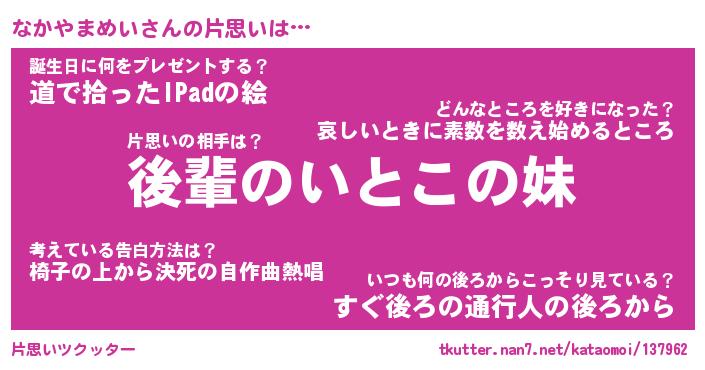 | ヘコむあだ名 | 『なかもー』『豆乳』『なかっちょ』 |