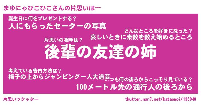 | 胡散臭い通販商品みたいなあだ名 | 『億万長者になれる霊験あらたかなお札…その名も「まゆにゃひこひこ」』 |