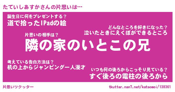 | 胡散臭い通販商品みたいなあだ名 | 『必ず成功する水晶球…その名も「たていしあすか」』 |