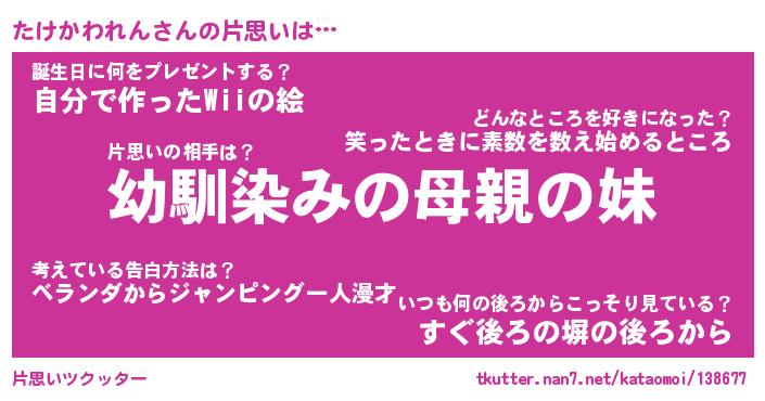 | 男性向けラノベタイトル風あだ名 | 『たけかわれんの憂鬱』 |
