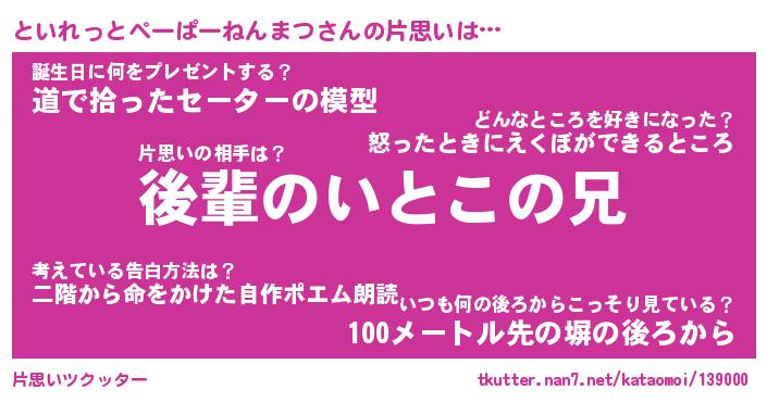 | 意味不明あだ名 | 『ペロリンといれっとぺーぱーねんまつ』 |