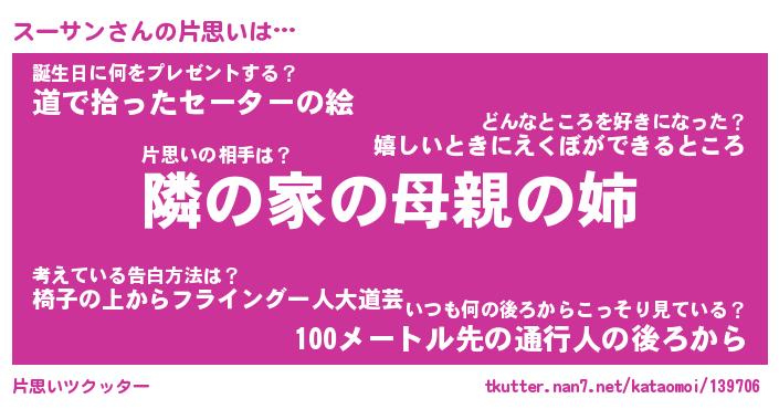 | 意味不明あだ名 | 『ペロリンスーサン』『永久保存スーサン』 |