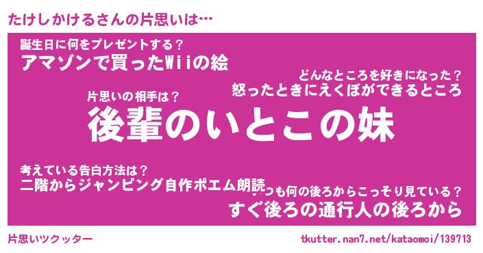 | ヘコむあだ名 | 『たけにゅー』『なまこ酢』『たけお』 |