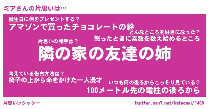 | ヘコむあだ名 | 『ミアもー』『なまこ酢』『ミアっ子』 |