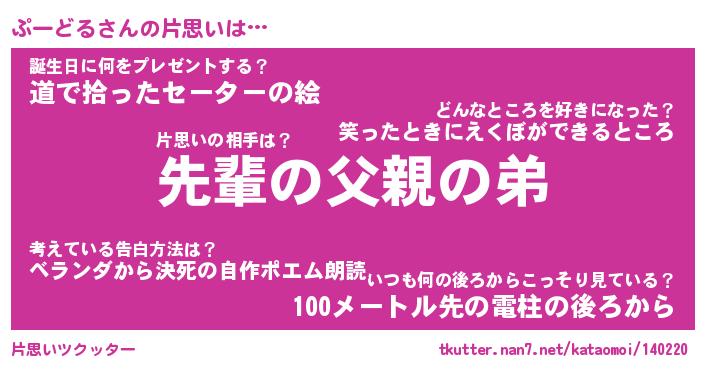 | 男性向けラノベタイトル風あだ名 | 『ぷーどるの憂鬱』 |