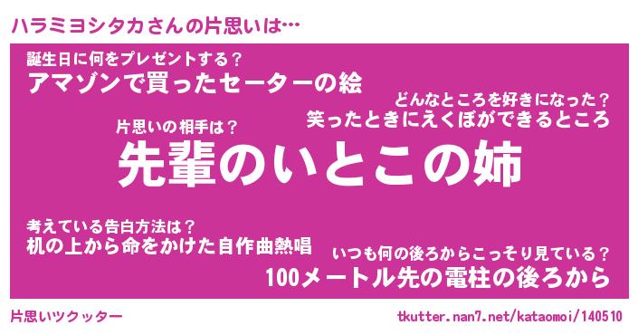 | 男性向けラノベタイトル風あだ名 | 『ハラミヨシタカの憂鬱』 |