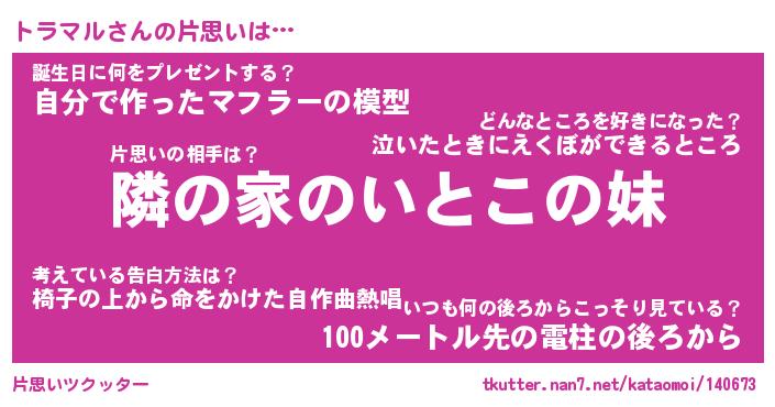 | 男性向けラノベタイトル風あだ名 | 『トラマルの憂鬱』 |