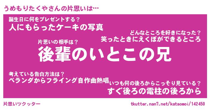 | 恥ずかしいあだ名 | 『プリティーうめもりたくや』『うめちん』 |