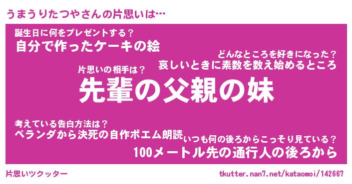 | 男性向けラノベタイトル風あだ名 | 『うまうりたつやの憂鬱』 |