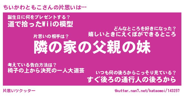 | 恥ずかしいあだ名 | 『プリティーちいかわともこ』『ちいちん』 |