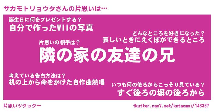 | 男性向けラノベタイトル風あだ名 | 『サカモトリョウタの憂鬱』 |