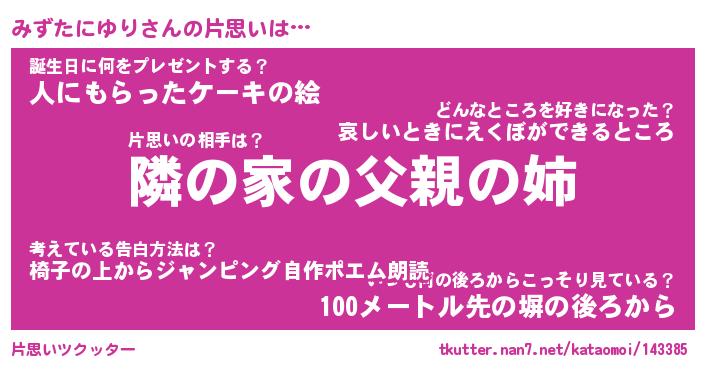 | 女子向けラノベタイトル風あだ名 | 『(仮)みずたにゆりのやんごとなき事情』 |