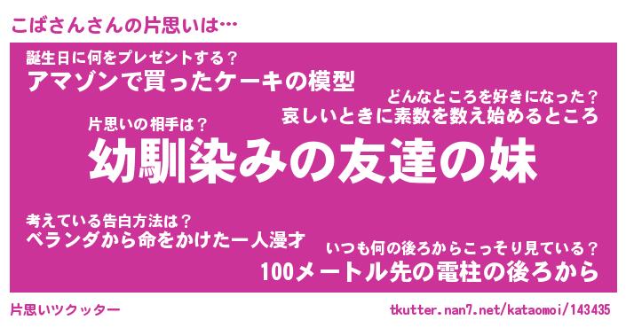| 女子向けラノベタイトル風あだ名 | 『(仮)こばさんのやんごとなき事情』 |