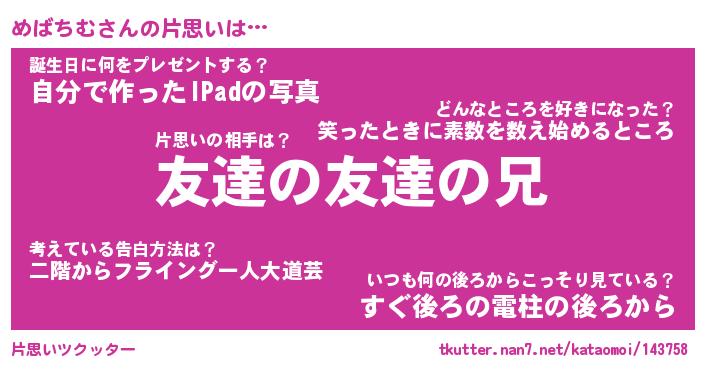| ヘコむあだ名 | 『めばっふぃ~』『つくし』『めばお』 |