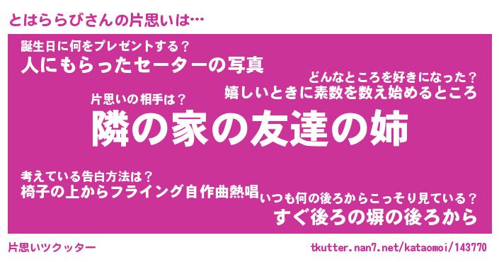 | 男性向けラノベタイトル風あだ名 | 『とはららびの憂鬱』 |