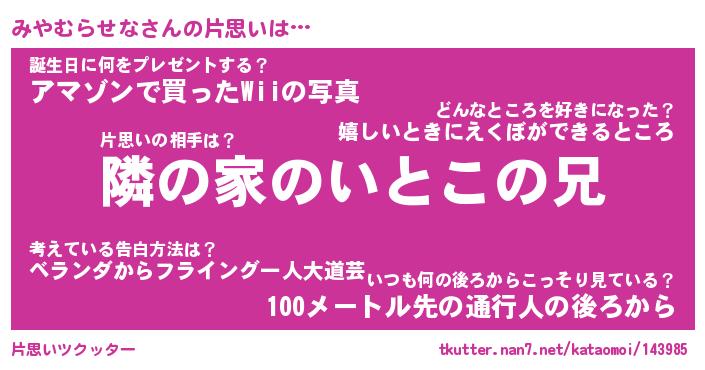 | ヘコむあだ名 | 『みやもー』『なまこ酢』『みやお』 |