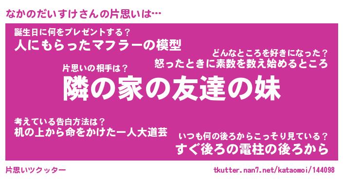 | 男性向けラノベタイトル風あだ名 | 『なかのだいすけの憂鬱』 |