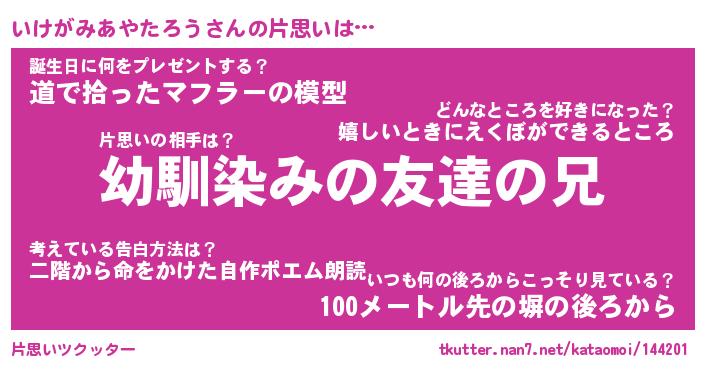| 女子向けラノベタイトル風あだ名 | 『(仮)いけがみあやたろうのやんごとなき事情』 |
