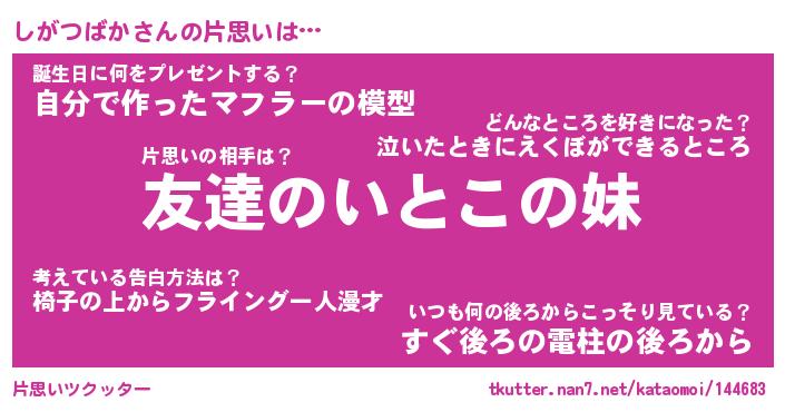 | ヘコむあだ名 | 『しがにゅー』『つくし』『しがを』 |