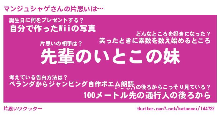 | 男性向けラノベタイトル風あだ名 | 『マンジュシャゲの憂鬱』 |