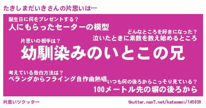| 男性向けラノベタイトル風あだ名 | 『たきしまだいきの憂鬱』 |