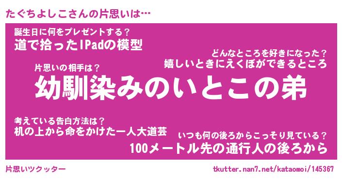 | 女子向けラノベタイトル風あだ名 | 『(仮)たぐちよしこのやんごとなき事情』 |