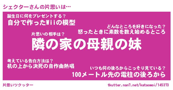 | 男性向けラノベタイトル風あだ名 | 『シェクターの憂鬱』 |