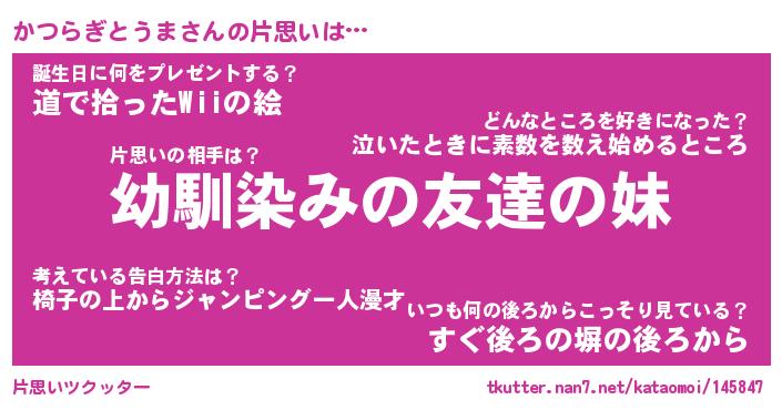 | 恥ずかしいあだ名 | 『プリティーかつらぎとうま』『かつちん』 |