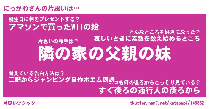 | 意味不明あだ名 | 『ペロリンにっかわ』『永久保存にっかわ』 |