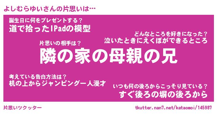 | ツイッター | よしむらゆいさんのツイッターID『kikurage_man』 |