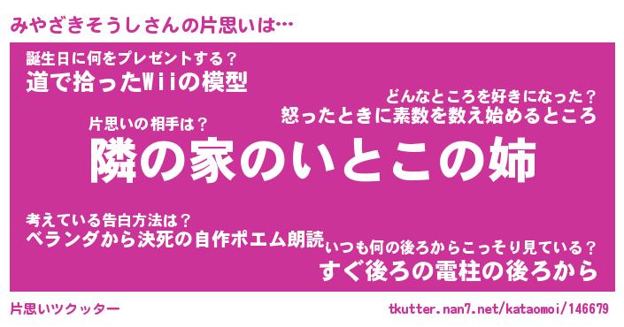 | 男性向けラノベタイトル風あだ名 | 『みやざきそうしの憂鬱』 |