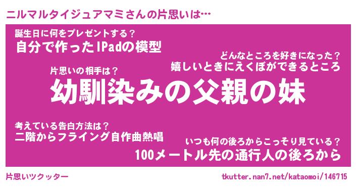 | 男性向けラノベタイトル風あだ名 | 『ニルマルタイジュアマミの憂鬱』 |