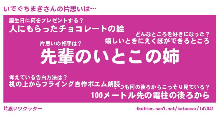 | 男性向けラノベタイトル風あだ名 | 『いでぐちまきの憂鬱』 |
