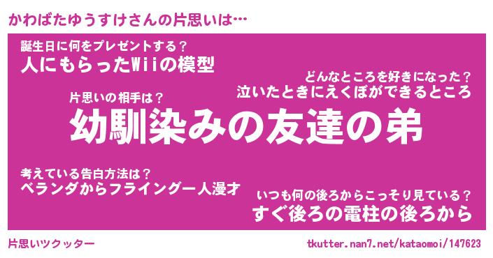 | 男性向けラノベタイトル風あだ名 | 『かわばたゆうすけの憂鬱』 |