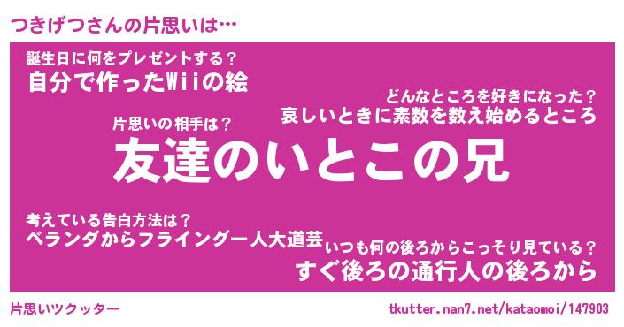 | 自動車の名前っぽいあだ名 | 『ツキティマ』『ツスラー』『ツンR』 |