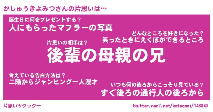 | ツイッター | かしゅうきよみつさんのツイッターID『namakemono_man』 |