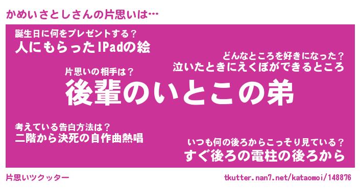 | ヒーロー風カッコイイあだ名 | 『スーパーカメイサトシ』『天弓騎士カメ』 |