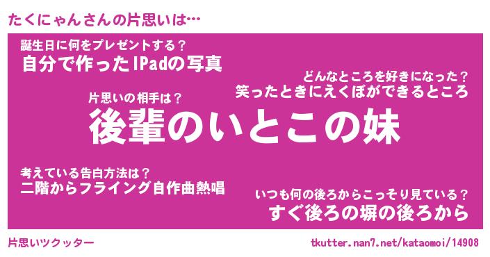 | ヘコむあだ名 | 『たくもー』『つくし』『たくお』 |