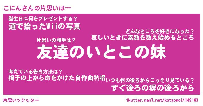 | ヘコむあだ名 | 『こににゅー』『豆乳』『こに太郎』 |