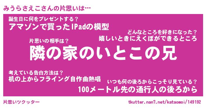 | ヘコむあだ名 | 『みうにゅー』『つくし』 |