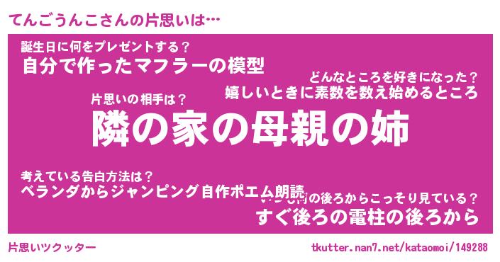 | 男性向けラノベタイトル風あだ名 | 『てんごうんこの憂鬱』 |