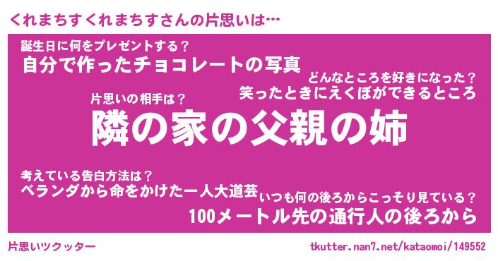 | 男性向けラノベタイトル風あだ名 | 『くれまちすくれまちすの憂鬱』 |
