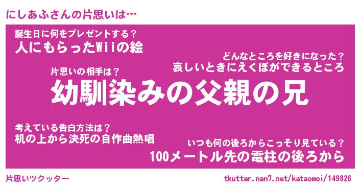 | 男性向けラノベタイトル風あだ名 | 『にしあふの憂鬱』 |