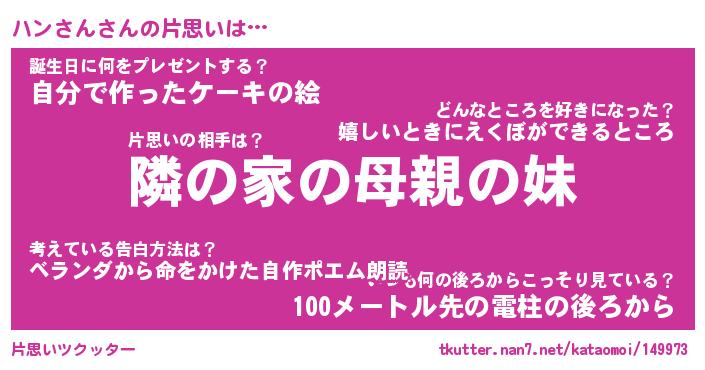 | ヘコむあだ名 | 『ハンにー』『つくし』『ハン太郎』 |