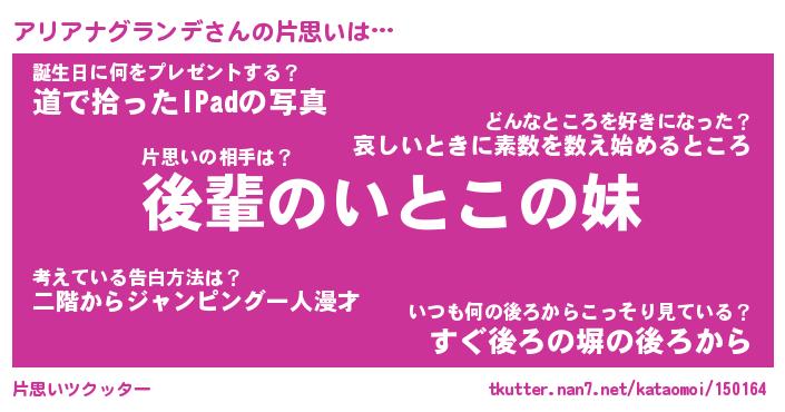 | 女子向けラノベタイトル風あだ名 | 『誰かこのアリアナグランデを説明してください! ~契約から始まるウェディング~』 |