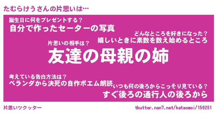 | 女子向けラノベタイトル風あだ名 | 『誰かこのたむらけうを説明してください! ~契約から始まるウェディング~』 |