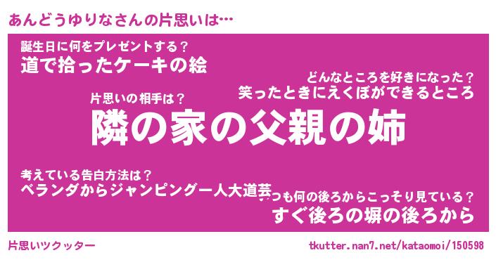 | 恥ずかしいあだ名 | 『プリティーあんどうゆりな』『あんちん』 |
