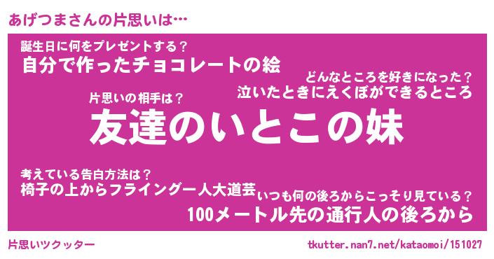 | 意味不明あだ名 | 『ペロリンあげつま』『永久保存あげつま』 |