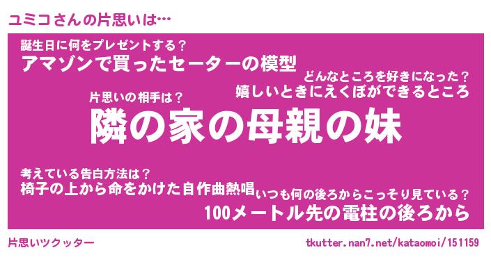 | ヘコむあだ名 | 『ユミにー』『なまこ酢』『ユミ太郎』 |