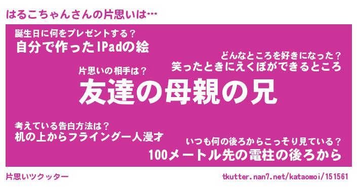 | 胡散臭い通販商品みたいなあだ名 | 『億万長者になれるブレスレット…その名も「はるこちゃん」』 |